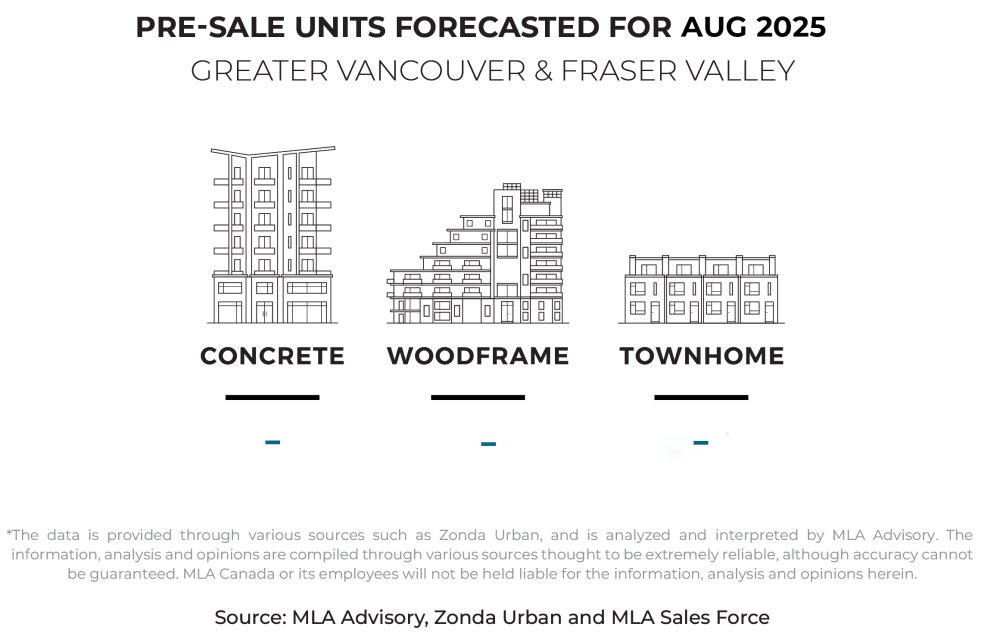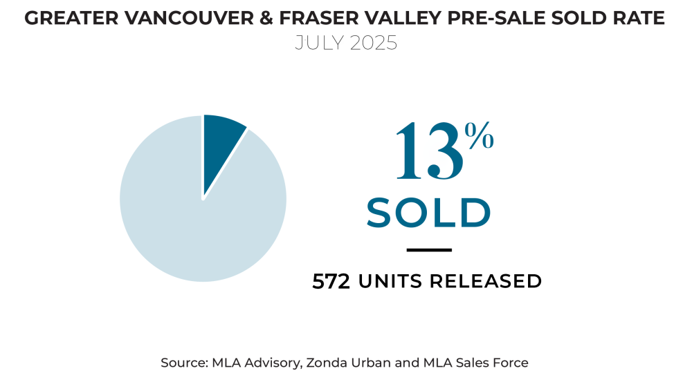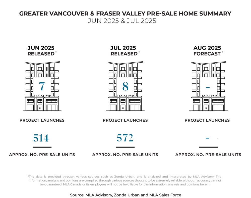 “The summer has been very quiet in the presale market. The July 30 interest rate hold by the Bank of Canada added little relief for homebuyers as the promised lower rate environment is not coming to fruition as expected. With continued slow sales centre traffic and negative sentiment toward investor product, we are expecting zero new project launches in August across the Lower Mainland.” — Garde MacDonald, Director of Advisory, MLA Canada