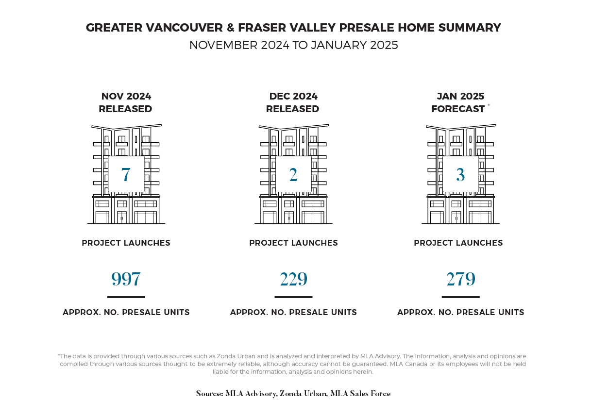 In January 2025, three projects are set to launch, releasing 279 units, in line with the slower pace seen in December. While buyer sentiment is expected to gradually improve as we enter the New Year, developers are likely to continue taking a thoughtful approach when releasing new product. Looking further into 2025, the challenges faced by the presale market in 2024 are anticipated to persist. MLA forecasts that, while the number of projects coming to market may increase slightly, the overall number of units released will remain lower. The market’s shift toward smaller-scale low-rise developments seen in 2024 is expected to continue into 2025, driven by limited investor interest and end-user demand as the primary market forces.