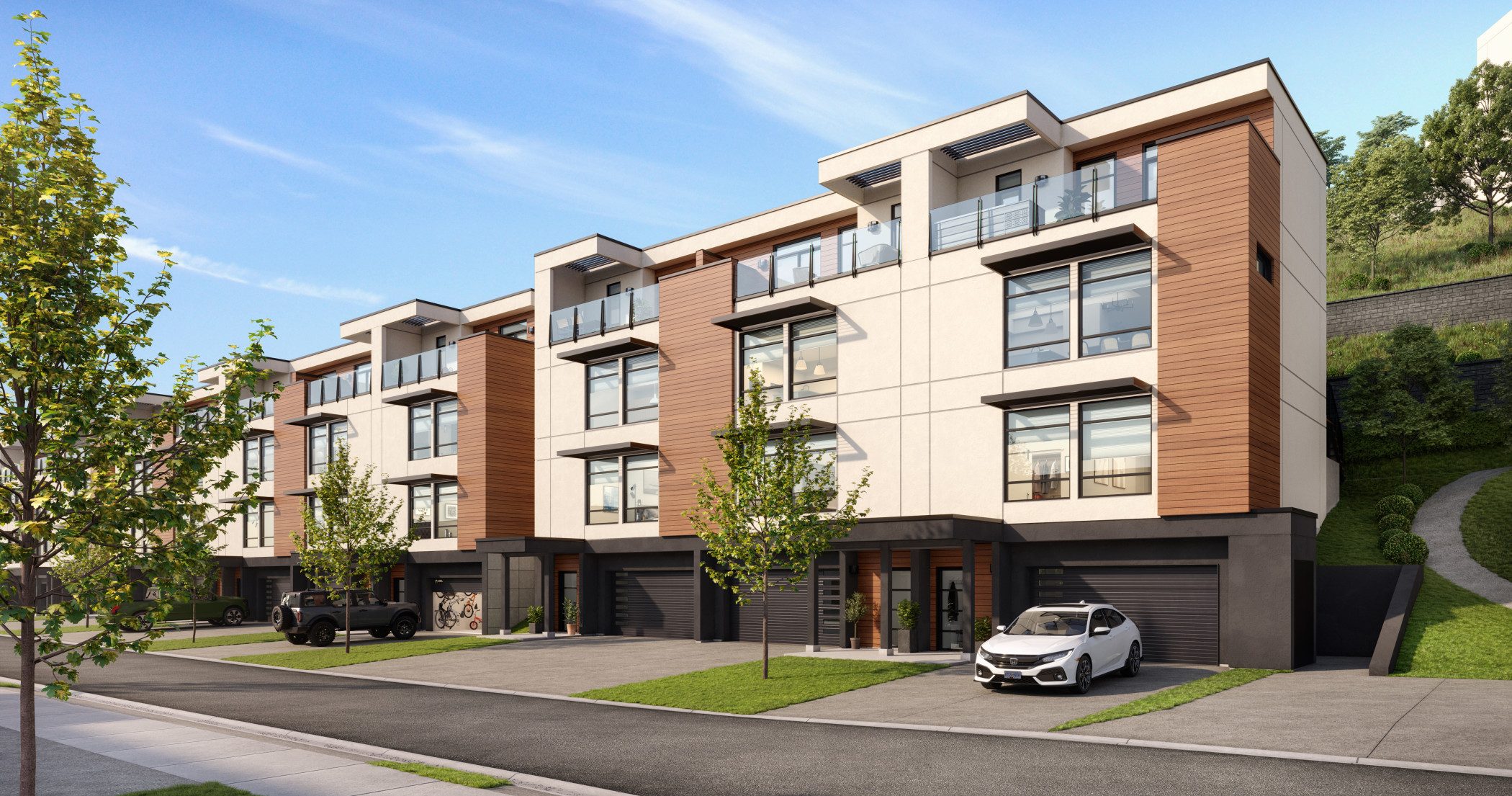 Tapering into the mountain, Somerset Heights combines luxurious living with the natural beauty of the Okanagan, perfect for those seeking both serenity and sophistication. These elevated townhomes are complete with an elevator that ascends to all floors of the homes for convenient access.