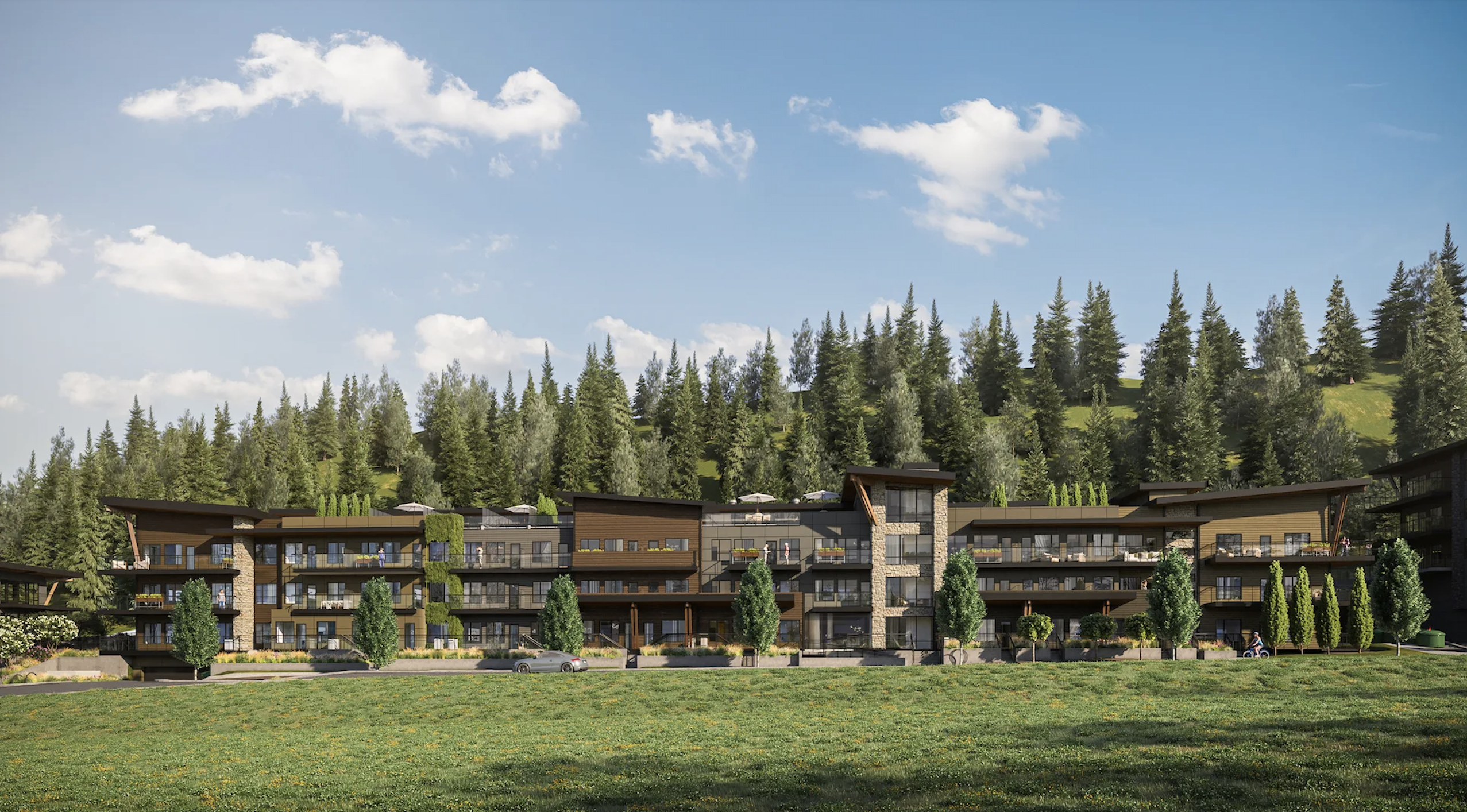 Offering one- to two-bedroom and den homes, the development features bold and modern architecture that complements its natural surroundings. A clubhouse lounge, hot tub, pool and indoor/outdoor entertainment space make for an amenity-rich building. Top-floor suites with private rooftop patios have especially spectacular mountain views.