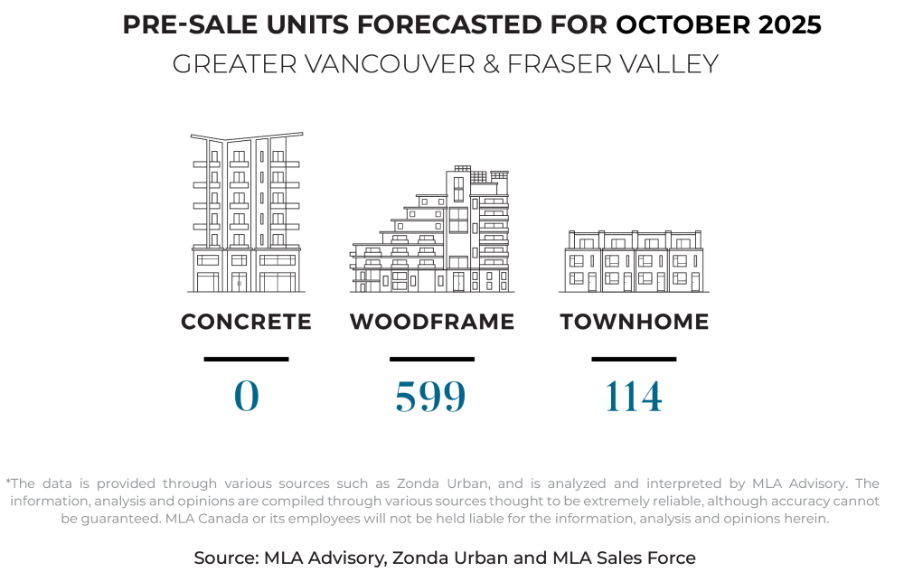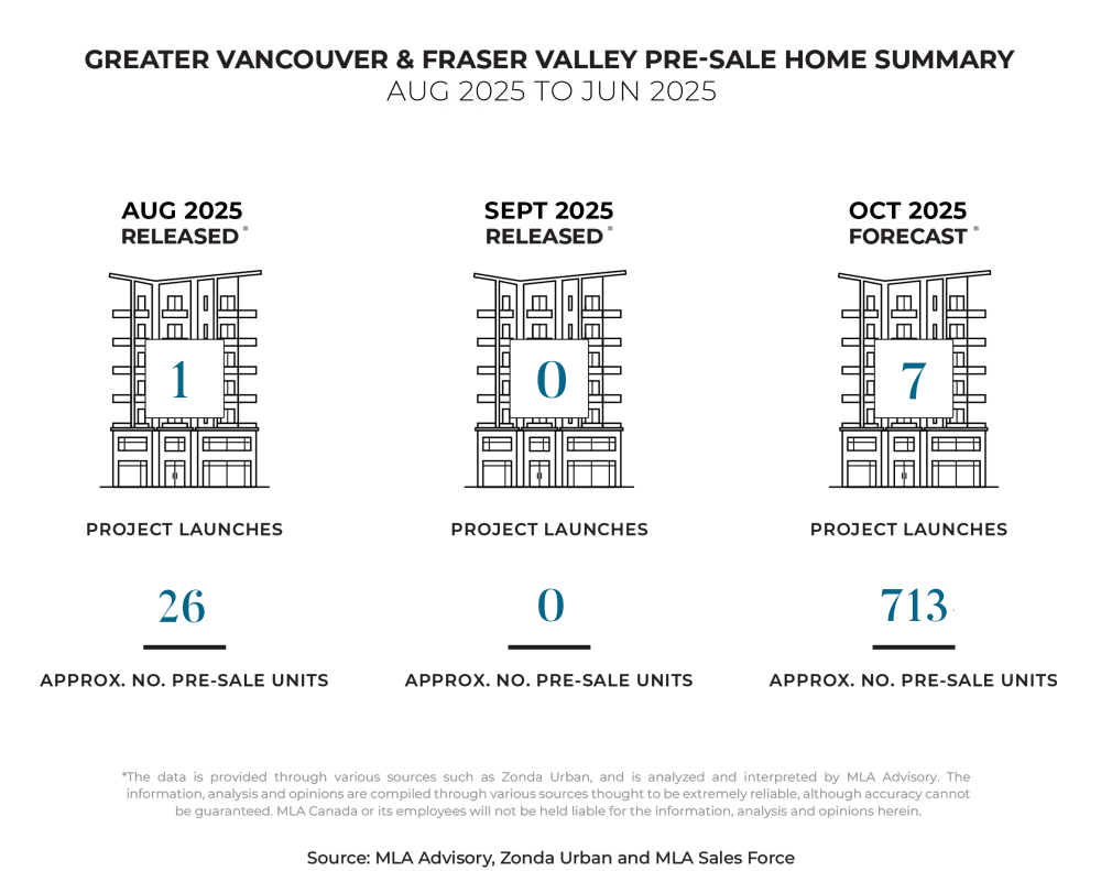“September saw zero new launches as upcoming projects took the time for extended previews to garner interest and adjust pricing. The 0.25% rate cut we saw in September has yet to spur a noticeable change in buyer habits across tempo sites. We anticipate a busier presale market in October, with a variety of new projects coming online, across multiple geographies and product types.” — Garde MacDonald, Director of Advisory, MLA Canada