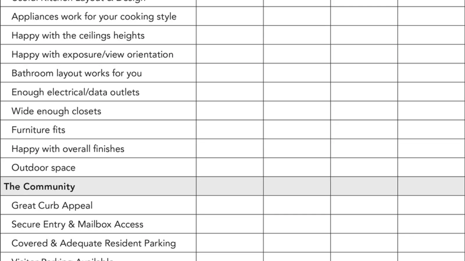What adds joy to your life – Certain features like innovative kitchen layouts, 12-foot ceilings, over-sized balconies, walk-in-closets, a particular view etc. could make your heart jump for joy. Be sure to listen to what you love because it’s your home and one of the biggest investments in your life.